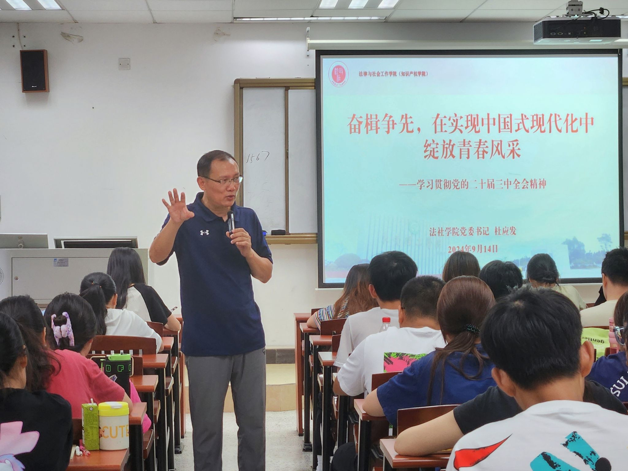 为深入学习宣传贯彻党的二十届三中全会精神,向同学们讲清楚全会的重大时代意义和深远历史影响,讲清楚我们党将改革开放进行到底的坚定决心,9月14日,法社学院党委书记杜应发以《奋楫争先,在实现中国式现代化中绽放青春风采》为题,为2023法学1班,2023法学2班,2023社会工作1班,2023社会工作2班等100多位同学讲秋季学期思政第一课。