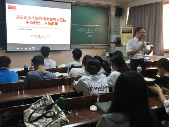 9月13日,法社学院党委书记杜应发为2020法学1班、2020法学2班、2020法学(知识产权)1班90多位同学上了一堂题为“以实现中华民族伟大复兴为己任不负时代,不负韶华”的思政第一课,与同学们共同学习了习近平总书记在庆祝中国共产党成立100周年大会上的重要讲话精神。