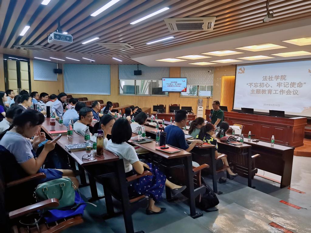 (知识产权)学院“不忘初心、牢记使命”主题教育工作会议在莞城校区模拟法庭召开,本次会议由学院党委书记杜应发同志主持,全体党员参会,学校主题教育联系指导组劳丹同志到会指导。