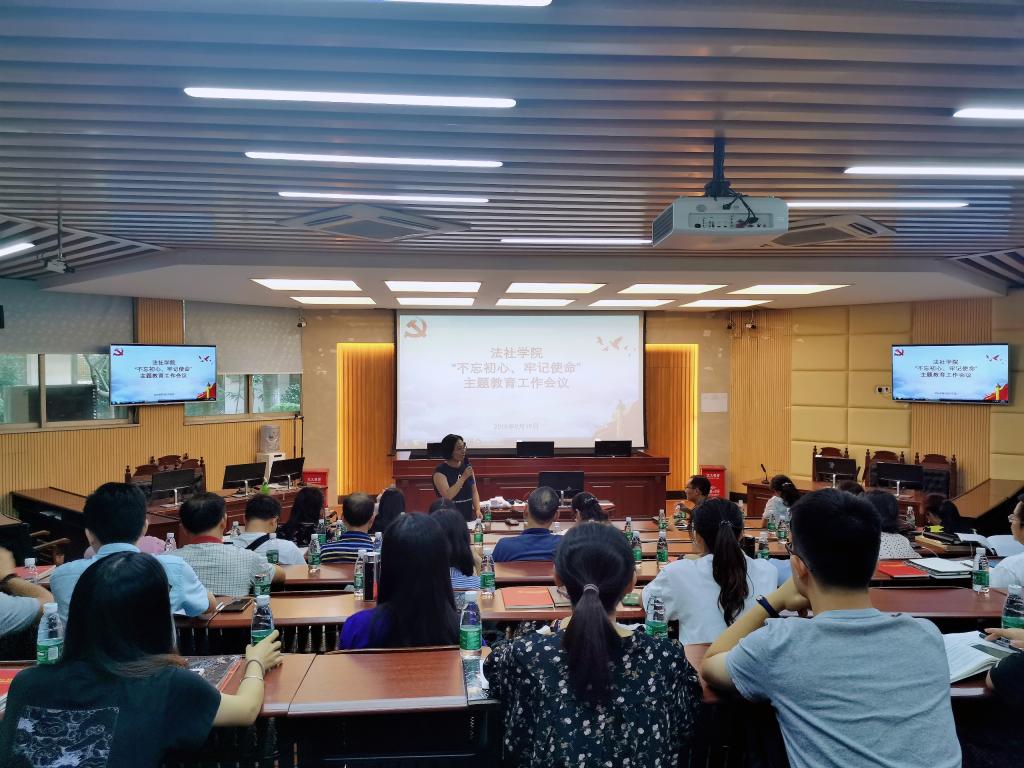 “不忘初心、牢记使命”主题教育实施方案》工作部署和要求,就开展好法社学院的主题教育,提出以下几点要求:一要充分认识主题教育重要意义。开展主题教育,是深入学习贯彻习近平新时代中国特色社会主义思想的具体行动,是全面加强党的领导、推进新时代党的建设的必然要求,是凝心聚力、全面加快学院发展的重要举措;二要全面把握主题教育任务要求。这次主题教育的总要求是全面把握守初心、担使命、找差距、抓落实。要把主题教育与庆祝新中国成立70周年结合起来,为推进新型高水平理工科大学示范校建设作出应有的贡献;三要确保主题教育取得实效。党委书记要履行第一责任人职责,班子成员要认真履行“一岗双责”,坚持高标准严要求,带头学习、带头调查研究、带头检视问题、带头整改落实。