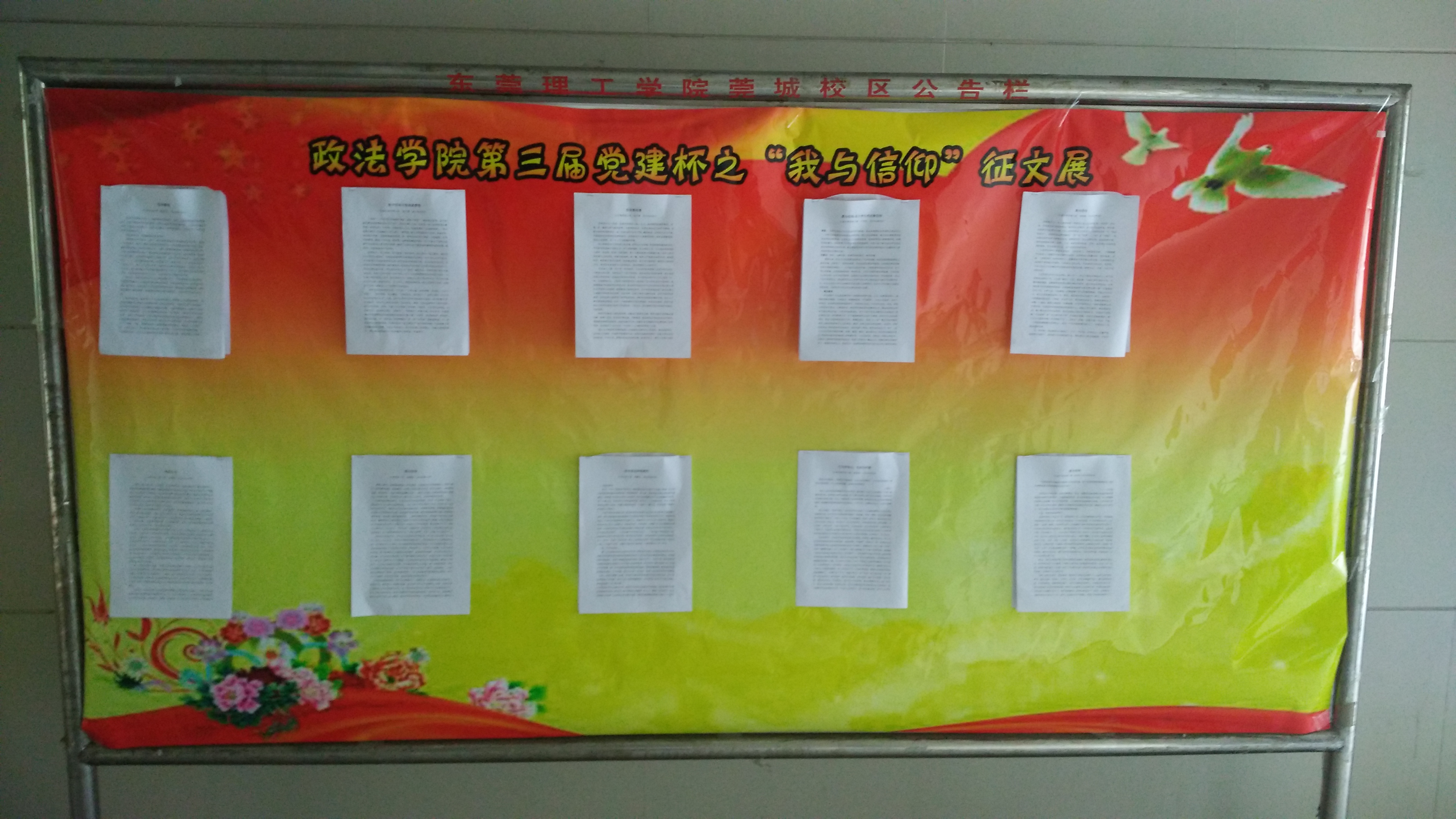 4月21号,政法学院学生党建办分别于松山湖校区经管楼和莞城校区一号教学楼对“党建杯——我与信仰征文比赛”优秀作品进行展示,观文气氛热烈,展示活动获得了圆满成功。