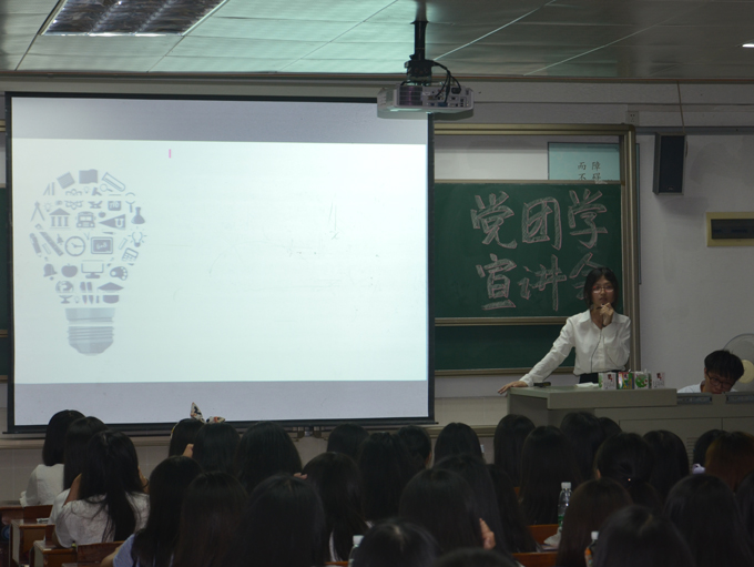 党建办先后在课室3408和学术报告厅以固定的出场顺序对大一新生们展开宣讲。在宣讲会上,莞城分支负责人谢明君首先以播放党建办过去一年的活动视频展开,视频开头的滑稽性引来全场的笑声,瞬时把大一新生们给吸引住了。视频结束后,谢明君简单扼要地给大家介绍了党建办这个年轻生命,大家已经迫不及待想要深入了解党建办这个组织的情况了。接下来就是党建办两大部门的宣讲时间了,分别由组织部部长陈丽婷和秘宣部部长古雅恩给师弟师妹们进行部门介绍。两部门的PPT制作简洁明了,部长们给大家详细具体的介绍部门的特点,让大一新生们对党建办有了进一步的了解。会上,党建办还安排了幕后工作人员调控现场,全场井然有序地进行着。最后,2015年政法学院三大组织招新宣讲会随着党建办的宣讲而完美落幕。