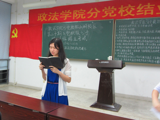 2015年6月7日晚上7点45分,松山湖校区经管楼216举行了以检验院党课培训成果为目的的入党积极分子结业考试。本次松山湖校区结业考试应到27人,实到24人。