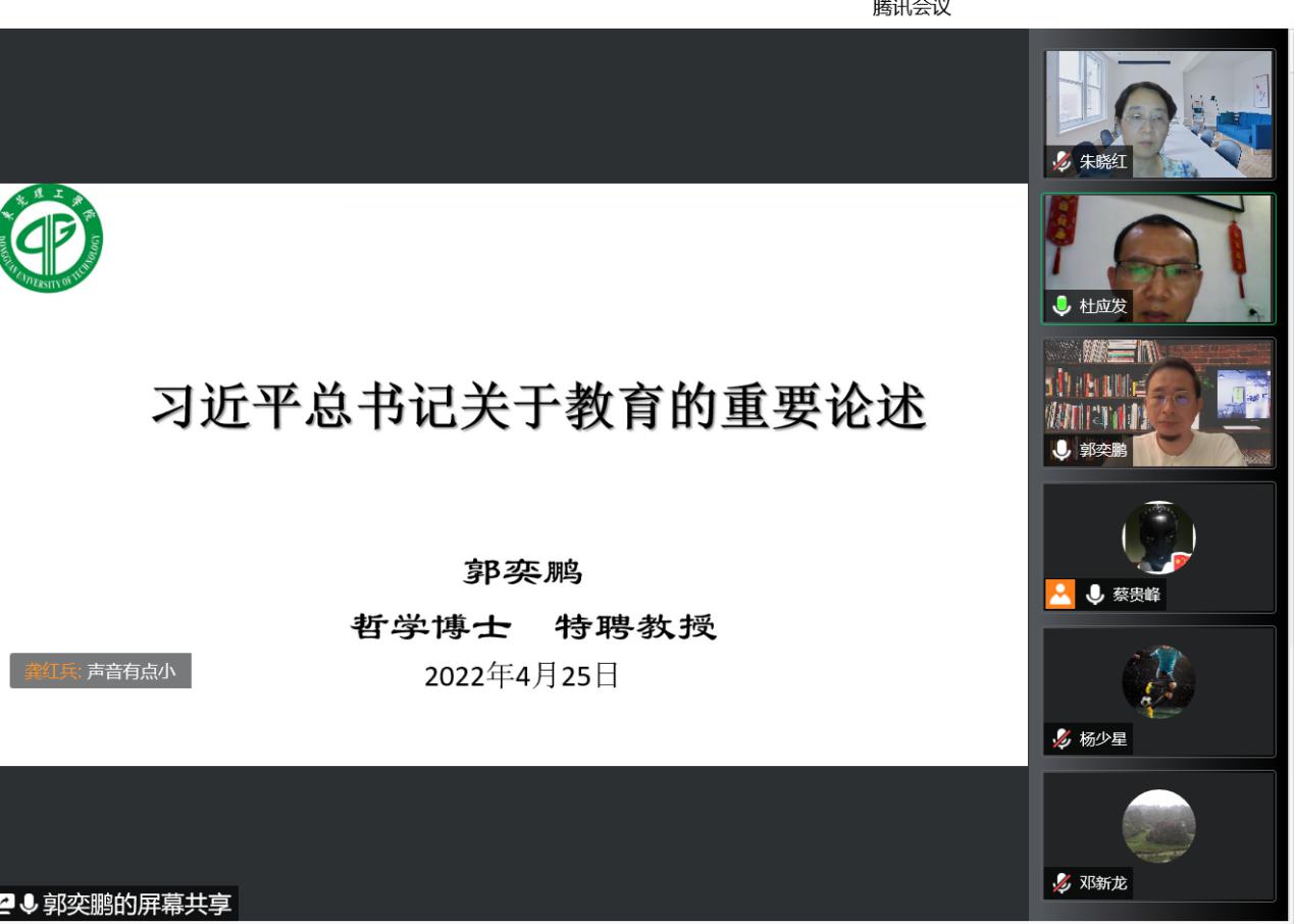(知识产权学院)党委邀请马克思主义学院党委副书记、特聘教授郭奕鹏为学院全体教师作“习近平总书记关于教育的重要论述”的专题讲座。会议由学院党委书记杜应发主持,法社学院全体教师参会。会议采用线上直播的形式进行。