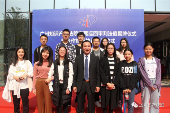 2019年12月26日,在我校和广州知识产权法院、东莞市中级人民法院知识产权战略合作框架协议签约暨广州知识产权法院东莞巡回审判法庭挂牌仪式上,东莞市市场监管局周锦辉副局长和拟实习的19级知识产权专业的同学合影留念