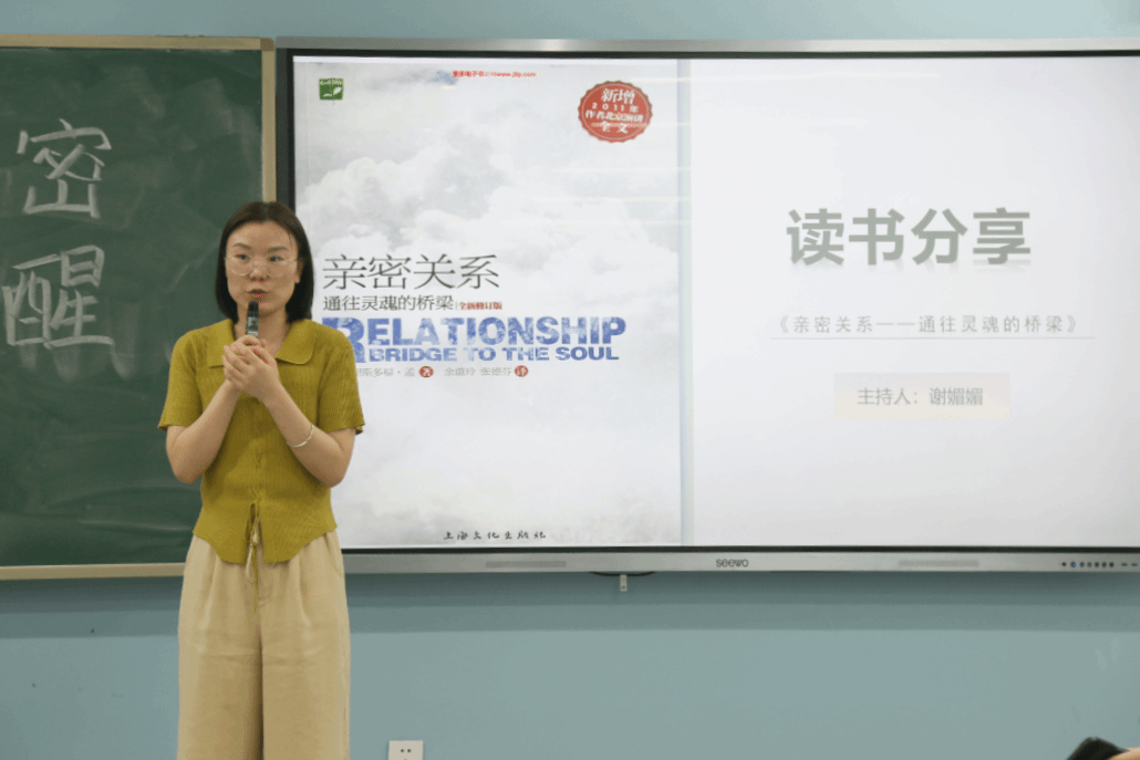 活动过程中,谢老师为大家介绍了《亲密关系——通往灵魂的桥梁》这本书的核心观点与作者的创作背景,让同学们对这本书有了初步的认识。随后,同学们纷纷分享自己的阅读心得,有的从个人经历出发,讲述了如何在亲密关系中寻找自我、实现成长;有的则从书中的理论出发,探讨了如何更好地理解和应对亲密关系中的冲突与误解。
