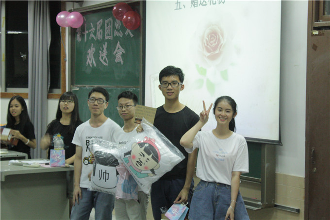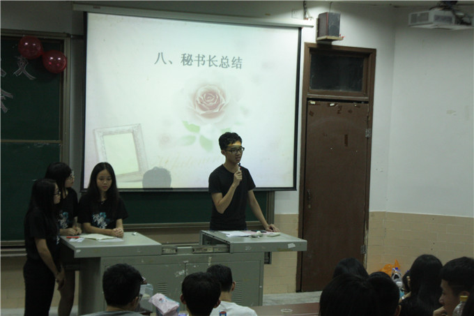 本次欢送会开始便是嘉宾介绍,再由各个部门的干事介绍本部门的部长和副部长们。逐一介绍完后,开始播放整个团总支的回忆视频。放完视频则是最激动人心的游戏环节和惩罚环节,其中游戏环节分别是猜猜我是谁和我爱猜歌名,这个环节中欢声笑语不断,大大的活跃了此次欢送会的气氛。欢乐的游戏环节结束,则到了部门干事向书记团赠送礼物的环节。在书记团带着礼物合照完毕,就到了感人的干事告白环节。秘书长上台总结发言。最后,团总支整体合唱最美的太阳,合影留念。