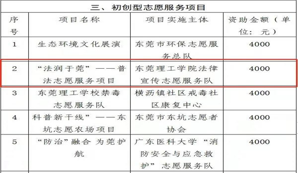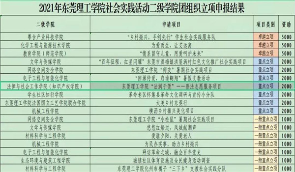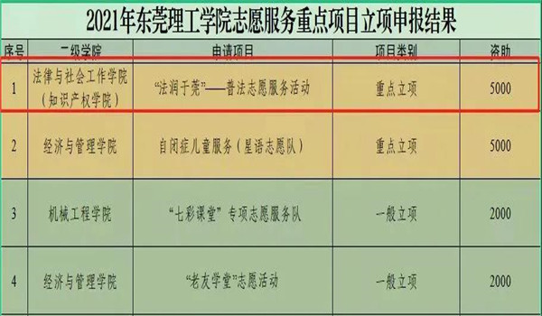 近日2021年东莞市“益苗计划”获奖项目和组织名单已公布,以学校的名义参赛的法社学院大学生普法志愿项目“法润于莞——普法志愿服务活动”获得立项扶持。