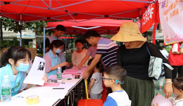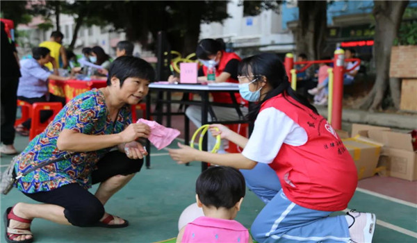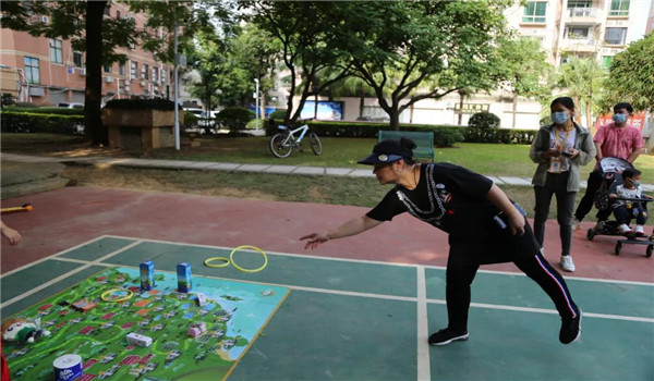 15名志愿者负责在互动体验区与兑奖区进行现场指引。互动体验区的志愿者负责引导社区居民进行游戏互动,居民通过游戏后,志愿者在其游戏卡上盖上印章,集齐四个印章的居民可到兑奖区兑换奖品。四个游戏老少咸宜,吸引大量的居民前来参加,活动现场气氛十分活跃,居民们脸上洋溢着愉快的笑容。