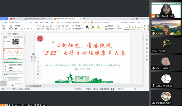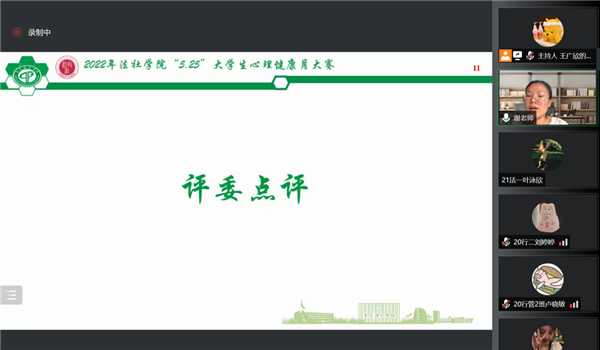 为了更好地普及心理健康知识,鼓励同学们以积极乐观的心态面对大学生活,法社学院于5月25日晚7:30在腾讯会议举行“心向阳光,青春绽放”“5.25”大学生心理健康月大赛第一阶段的决赛。辅导员谢媚媚、青年教师杨瀚博和心理中心的欧阳晓莹老师担任本次比赛的评委。