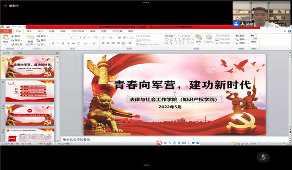 为深入贯彻落实全国大学生征兵工作会议精神,促进同学们深入了解征兵的各方面信息,呼吁同学们积极参军入伍,法社学院于5月31日晚7点在腾讯会议举行军旅分享会暨2022大学生参军入伍动员会,辅导员邹欢出席本次活动。
