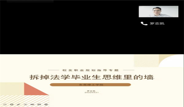 2022年5月31日,法社学院邀请2008届优秀校友罗志凯师兄为即将步入大四毕业的法学专业学生作就业规划指导。会上,罗师兄首先介绍2022年东莞律师行业的现状,鼓励大家要敢于挑战;随后他结合自己毕业十余年来丰富的法务经验为同学们总结讲述了十种关于职业规划的认知观点,比如要转换习以为常的心智模式、找到自己所热爱的,创造不确定性,成功学不能学等等,引导同学们树立正确的观念,传播正能量。
