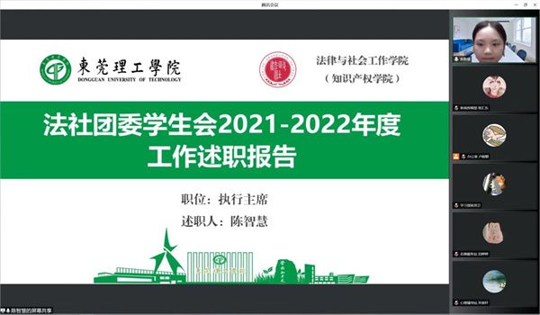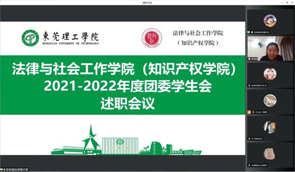 师生服务,法社学院于2022年7月10日晚7:30在腾讯会议软件上举行了团委、学生会述职会议。本次会议由法社团委、学生会执行主席陈智慧主持,学工办主任钟丽华、辅导员邹欢、团委、学生会委员团及团委、学生会各部门的主要负责人出席了此次会议。