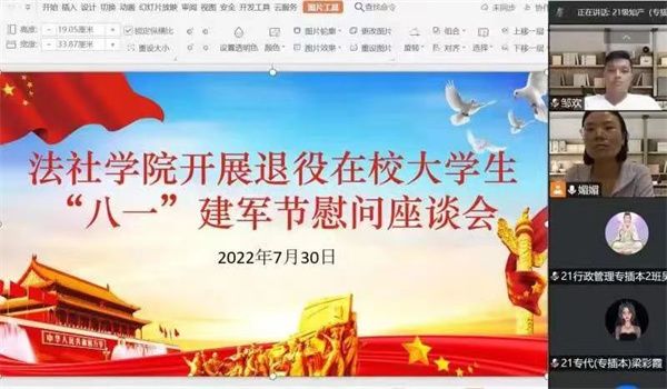 中国人民解放军建军95周年之际,为深入了解退役大学生士兵的思想、学习、生活等方面状况,向退役大学生表达节日的祝福和关怀,7月30日19:30,法社学院在腾讯会议组织召开退役大学生士兵座谈会。出席座谈会的有:邹欢老师,谢媚媚老师。