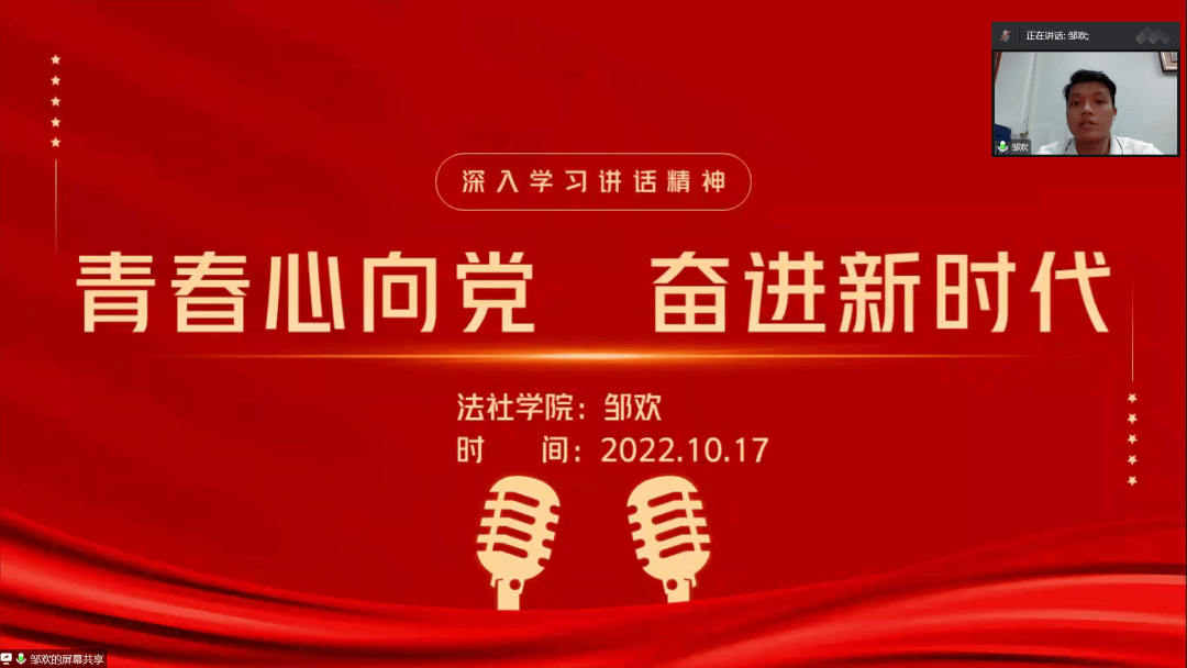 会议第一项,辅导员邹欢授课。邹老师结合具体历史事件,带领同学们回顾共青团的百年历史和百年征程,指出青年人要积极承担起新时代所赋予的使命与责任。