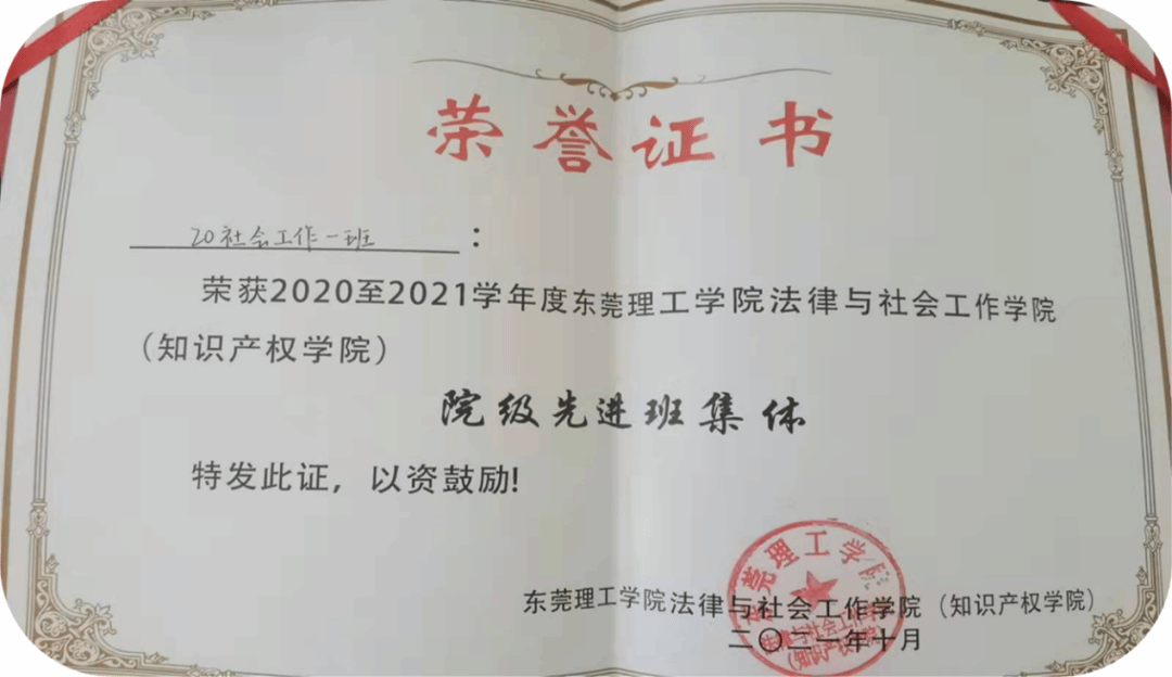 (知识产权学院)“院级先进班集体”荣誉称号。追求卓越,开拓进取是我们集体的代名词。我们总结成长的经验,再接再厉,在未来我们会以更高的标准严格要求自己,争取更大的进步!