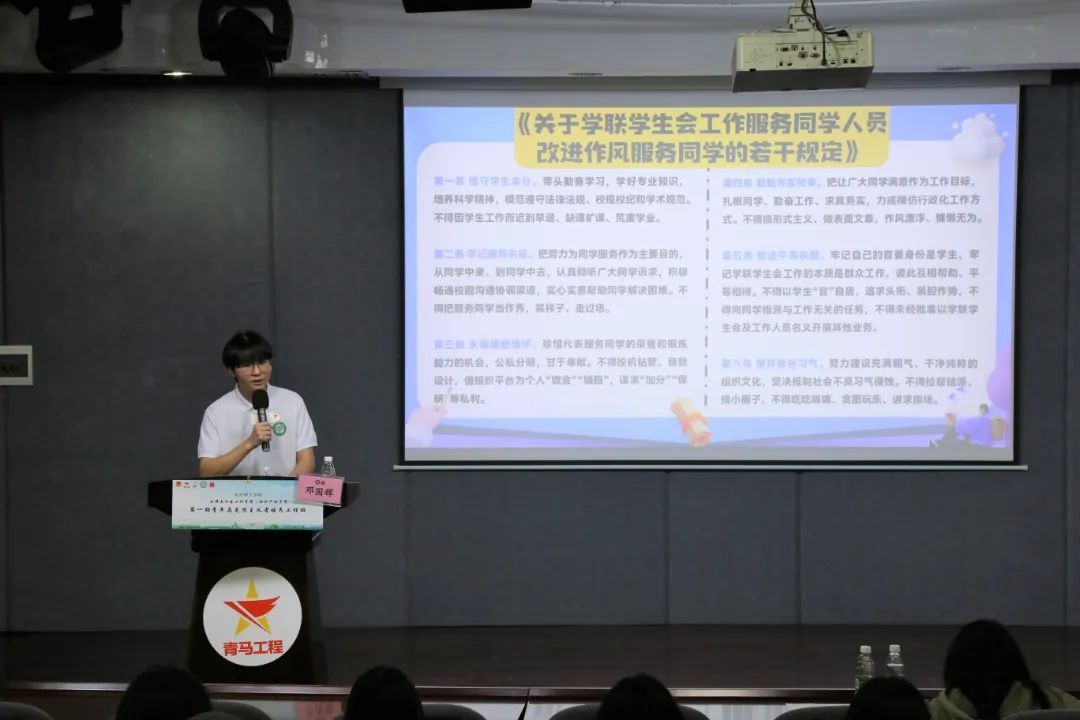 (知识产权学院)第一期“青马工程”培训班(以下简称青马班)邀请校学生会执行主席邓国辉学长为青马班全体学员开展“新时代青年的青春关键词”主题分享会,以此加强学生组织队伍建设,打造一批理想信念坚定、工作能力突出、综合素质过硬的学生骨干,进一步增强组织的凝聚力、战斗力。