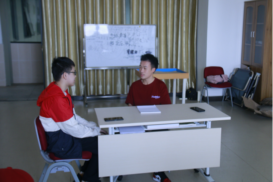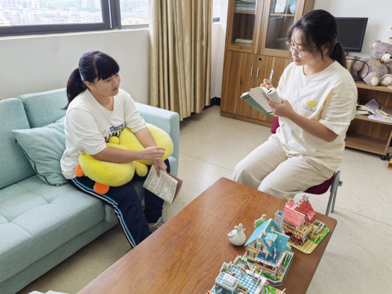 教师杨瀚博心理咨询师与成伟老师一起为学生指导。