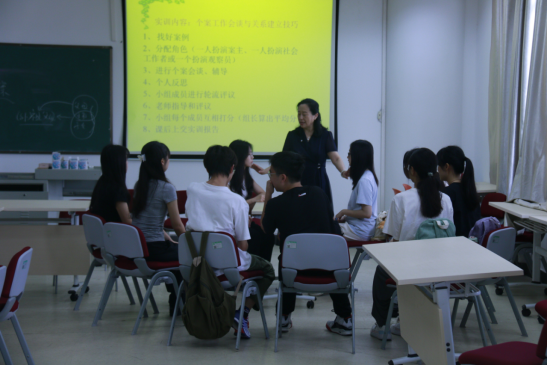 实训课开始后,所有同学按照事先安排好的分组,井然有序地进行个案工作会谈。各组同学安排合理,设置了个案工作者、案主以及观察员三种角色,沉浸式体验个案工作会谈的过程,真正从理论走到实践,从个案书本走进实际会谈。在每组会谈结束后,各组进行了小组评议以及自我评述等环节,同学们在实训过程中循序渐进,不断体验个案工作的魅力。成伟老师、刘智琴老师和杨瀚博老师也为同学们提供了坚实的专业后盾指导,认真观看同学们的实训过程,立足于个案工作专业性知识与社会工作实务经验给出了指导性意见,推动个案工作实训顺利进行。在此过程中,同学们也展现出了极高的学习与实践热情,积极进行会谈,向老师提出专业上的问题,这些问题也得到了老师们的积极回复。在实训课结束前,成伟老师也身体力行,亲自扮演了社会工作者,为同学们做出专业会谈的示范,也为扮演案主的同学解决了自身的困惑和烦恼,让同学们亲眼观摩到真实专业的个案工作会谈。