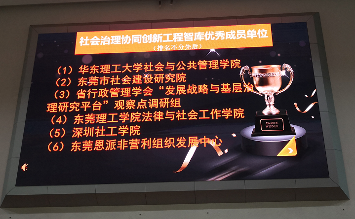1月9日下午,横沥镇“和谐善治 共建共享”社会治理协同创新工作推进会在横沥镇政府大会堂举行。镇领导班子相关成员、镇社会治理协同创新工程成员单位负责人、镇各村、社区党工委书记、主任、分管民政、治安及群团的两委干部、镇各商协会理事以上成员、镇社会治理协同创新工程智库合作单位等近300人参加了大会。镇领导为2018年度参与社会治理的先进集体、个人颁发牌匾及证书。法社学院被授予 社会治理协同创新工程智库优秀成员单位,副院长朱晓红副教授被授予社会治理创新项目突出贡献奖。