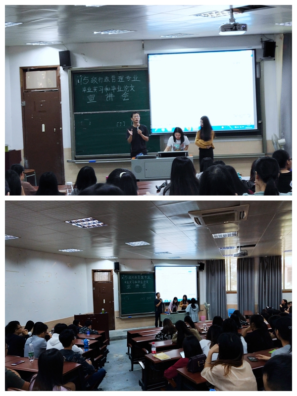 为了推动2015级行政管理专业毕业实习与毕业论文工作的顺利开展,11月13日上午,公管系在莞城校区6#1召开了毕业实习与毕业论文宣讲会。本次宣讲会由公管系主任杨少星老师和黄海蓉老师负责。