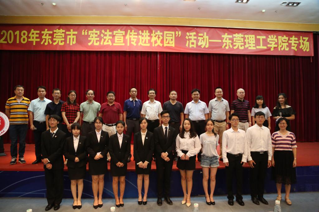 5月24日下午,东莞市司法局、市普法办携手我校麻豆 ,联合东莞电视台、东城街道等相关政府单位在莞城校区学术报告厅举办了“2018年东莞市宪法宣传进校园”普法活动。东莞市司法局副局长袁洪昌、东莞广播电视台副台长郑远龙、东城街道党委副书记吴沛林、我校法社学院院长强昌文及副院长夏能礼等领导出席了活动。 本次活动以情景剧再现了大学生就业性别歧视现象,通过就业平等与否的激烈辩论引发学生学法兴趣与思考,最终以教师点评、宪法知识有奖竞答、集体诵读宪法条文和赠书仪式等环节创新了校园普法的方式,共计吸引了师生三百余人热情参与。 袁洪昌副局长指出,青少年法制教育是全面依法治国战略的基础性工作和长期性工程,把法制教育纳入国民教育体系,并在国民教育体系中系统规划和科学安排是法治建设的重要任务。希望同学们在学习法律与知识的同时要更加注重法治信仰的培育,把法治精神、法治理念根植于心,充分发挥自己的特长,带动身边的人学法、尊法、守法、用法,当好法治理念的传播者、维护者,争做一名优秀的社会主义法治人才。 本次活动将在东莞电视台《与法同行》栏目播出。