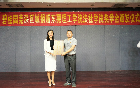 首先夏能礼副院长简要地为同学们介绍了“自强奖”“展翅奖”以及“领航奖”,并对碧桂园莞深区域表达衷心的感谢,希望同学们积极参与评选,不断提高自身综合素质。紧接着,特邀嘉宾王丽莎女士在发言中表示同学们应“铭记来时路,常怀感恩心”,希望大家在大学可以坚定职业理想信念,不断追求美好时光,加之勤奋学习,把学习作为一种习惯,同时,修身崇德,涵养品格,做一个有道德的大学生。随后,为表校企合作的深厚友谊,法社学院代表强昌文院长与王丽莎女士互赠礼品。最后,颁奖仪式正式开始,颁发了碧桂园自强奖学金、碧桂园展翅奖学金、碧桂园奖学金领航奖等多类奖学金。颁奖结束后,碧桂园自强奖学金获得者代表周甜甜、领航奖学金获得者代表彭科超分别发言。