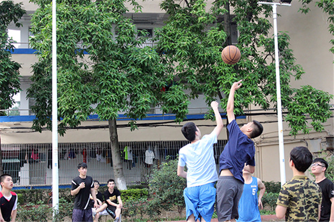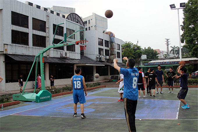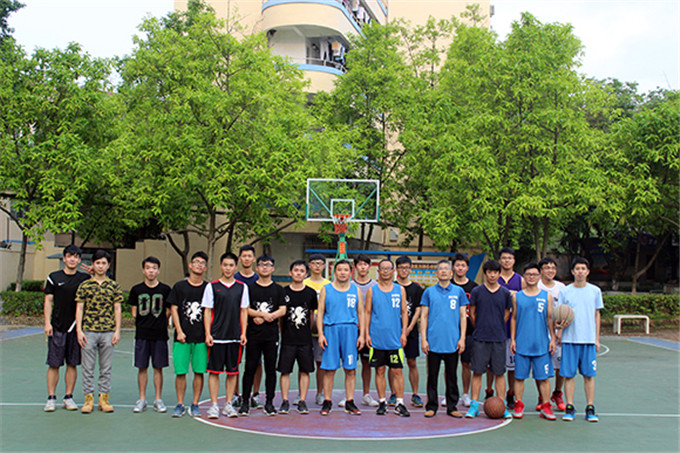 师生在教师饭堂旁边的篮球场举行了师生篮球赛,参与人员主要有院长强昌文、书记潘荣新等老师和16级法学卓越班。