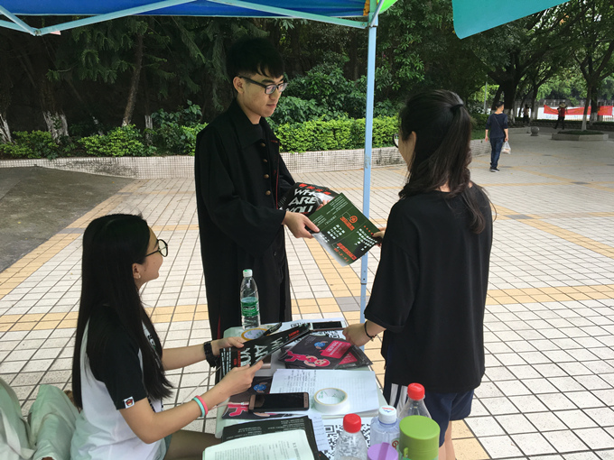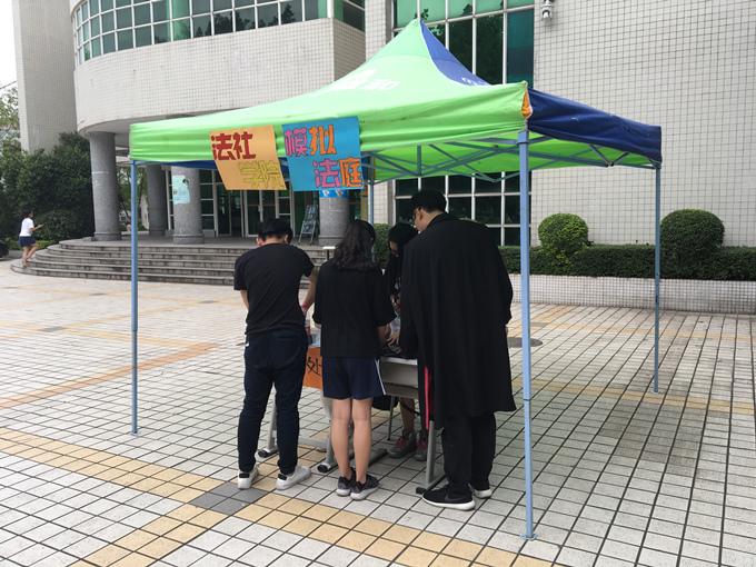 学生会为开展莞工第十二届科技学术节之模拟法庭活动,在莞城校区一饭前和图书馆篮球场前进行了摆摊宣传活动。