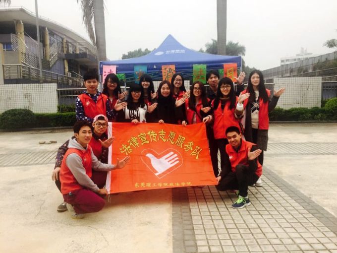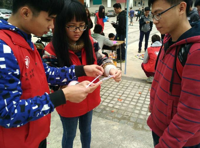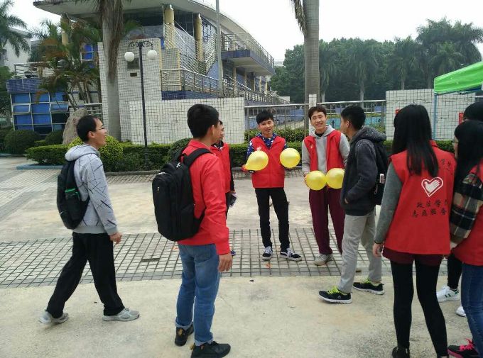 2016年3月16日下午,法宣队小干事在图书馆前为自己第一次策划的活动做准备。活动围绕《消费者权益保护法》展开,参与者不仅可以通过挤气球、摸法口授、趣味多米诺骨牌游戏获得有关消费者权益保护法的知识,同时也可以得到精美的礼品。