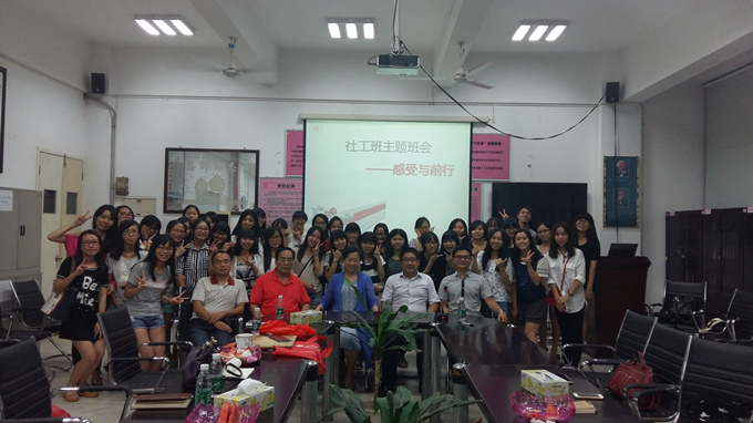 2013级社会工作专业的同学在经管楼211会议室举行了以“感受与前行”为主题的班会。学院院长强昌文、副院长夏能礼、社会工作教研室成伟教授、班主任李益民老师、邹朝春老师、辅导员邱可荣老师等出席了本次班会。