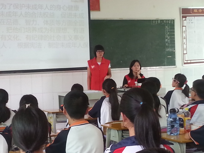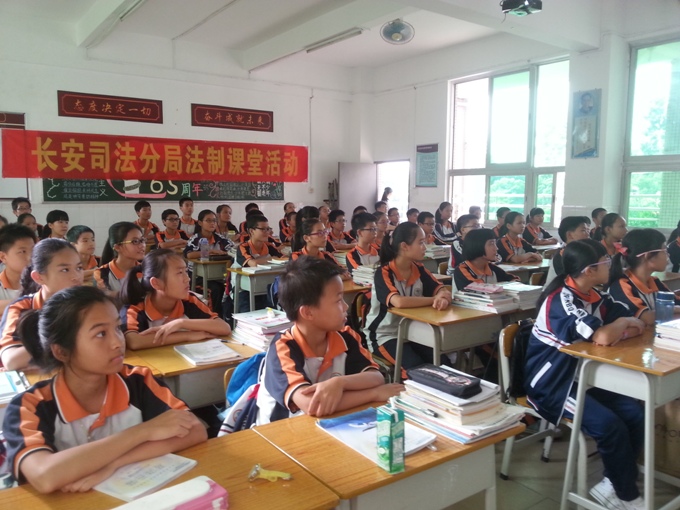 于下午3点,法宣队分为两个小组,分别为长安镇振安中学初二(8)班和长安镇振安小学四年级的同学开展了一节法制教育课堂。课堂气氛活跃,同学们不仅专注的听讲,而且还积极的回答问题。由于法律宣传的对象主要是中小学生,所以在课堂内容上的重点是宣传《未成年人保护法》和《预防未成年人犯罪法》等与未成年人密切相关的法律知识。在上课环节方面,既有 法律知识学习,又有有奖问答,还有漫画表演等,让中小学生能在课堂中轻松学法。