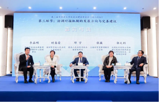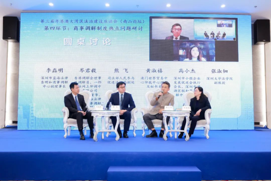 深圳市中级人民法院立案庭庭长时春蕾,香港国际仲裁中心理事暨香港调解会理事、一邦国际网上仲调中心有限公司(eBRAM)董事会成员、蓝海中心调解员岑君毅,澳门世界贸易中心仲裁中心秘书长黄淑禧,上海经贸商事调解中心主任张巍,深圳大学法学院副教授张淑钿,深圳市小微企业发展促进会会长、深圳市罗湖区联和商事调解中心理事长高小杰,北明软件有限公司助理总裁兼互联网法治产品研究院院长、法务部总经理郭文利等嘉宾参与圆桌讨论。