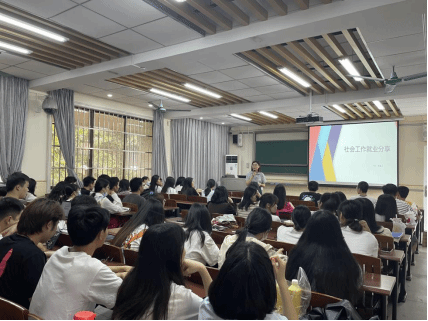 随后,曾老师介绍了东莞市社会工作机构的基本情况,例如机构的数量、规模、特色领域,对同学们所提出的“如何在众多机构中做选择”、“如何选岗”等疑惑进行解答,并详细介绍了社会工作的领域及工作内容,如:民政领域、残联社工、妇女儿童领域、医务社工、禁毒社工、司法社工等,其中重点介绍了民政领域中的双百工程,从关于政府打造兜底民生服务的相关政策和措施的科普,到双百社工的日常工作。同学们在曾老师全面又详细的介绍中离社会工作实务更近了一步。