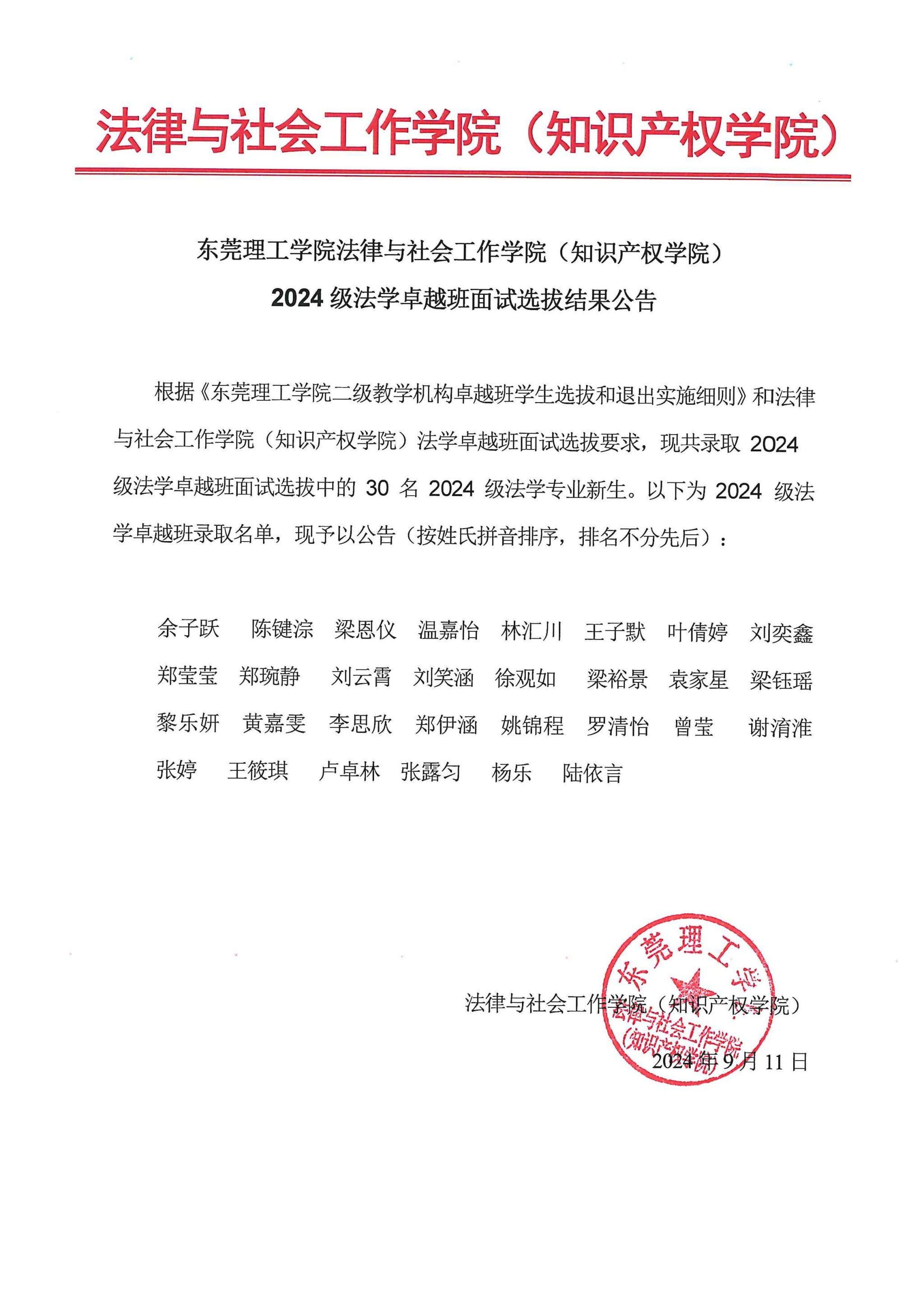 麻豆 (知识产权学院)2024级法学卓越班面试选拔结果公告