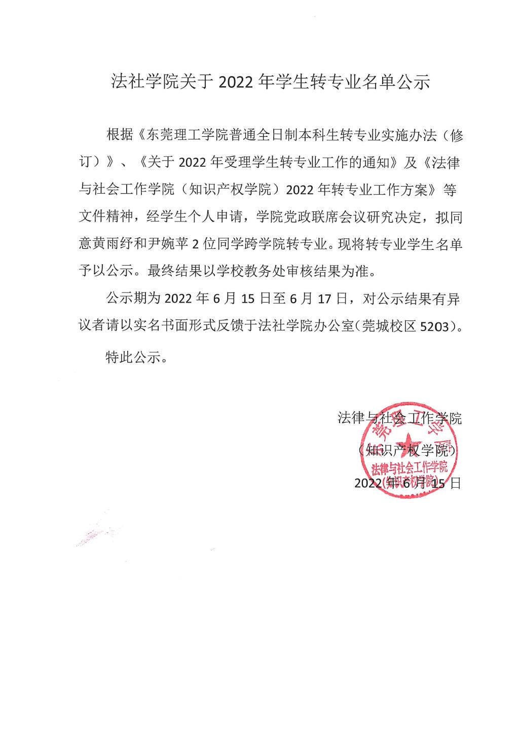 法社学院关于2022年学生转专业名单公示