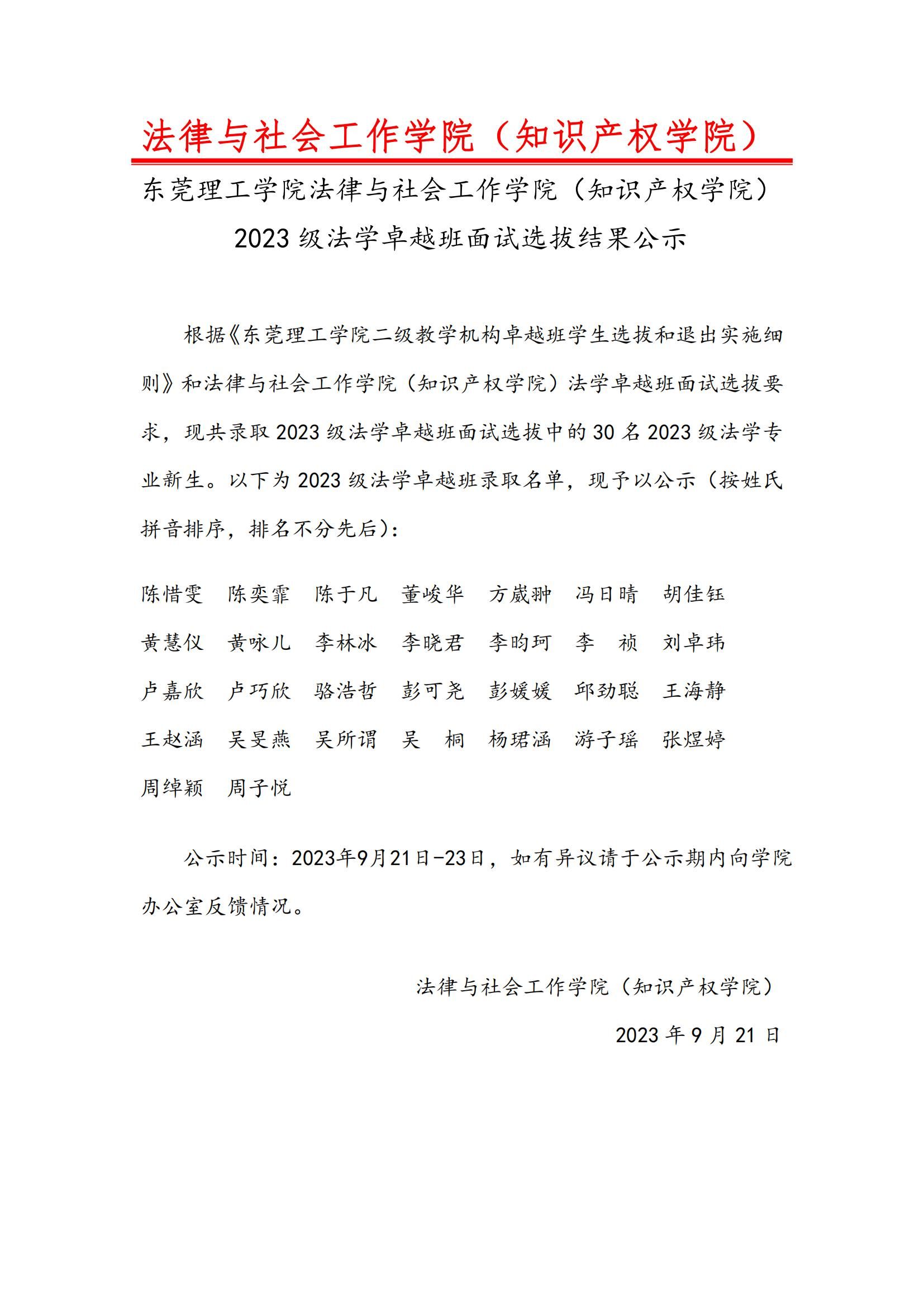 麻豆 (知识产权学院)2023 级法学卓越班面试选拔结果公示