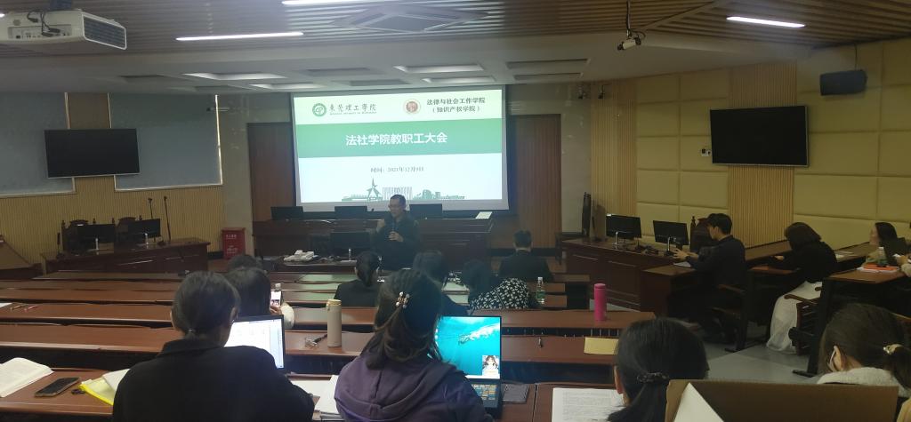 在莞城校区模拟法庭召开全员大会,会议由学院党委书记杜应发主持,学院近50名教职工出席了会议。