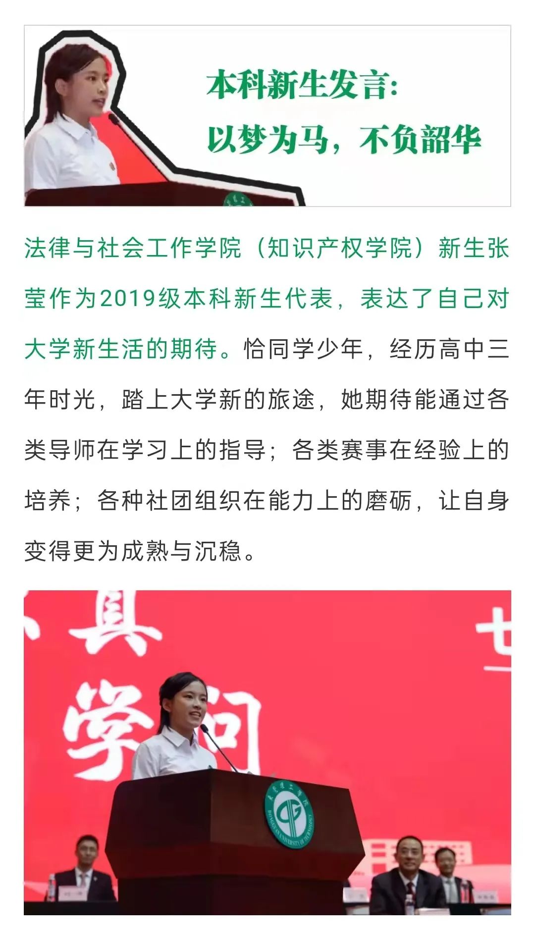 打破舒适圈的第一步,就是给自己找“不适”,每一次从“不适”到“舒服”的过程,都是一次蜕变。开学前学校征集新生发言稿,我抓住了这个机会,耐心地写稿、反复地改稿,最终通过了层层筛选,得到了代表莞工2019级全体新生在松山湖大礼堂发言的宝贵机会。那是我第一次穿上正装,戴着校徽,踏上大学的舞台,在几千人面前演讲,紧张得差点连手里的稿子都看不清。我已经忘记当时是怎么硬着头皮撑完五分钟的,但让我很惊喜的是,身边的同学告诉我:“你的演讲很有感染力,你很适合演讲”。正是那次的经历让我坚定了演讲的信心,对舞台的向往和期待渐渐萌芽生长。我决定,继续挑战自己,积累舞台经验。