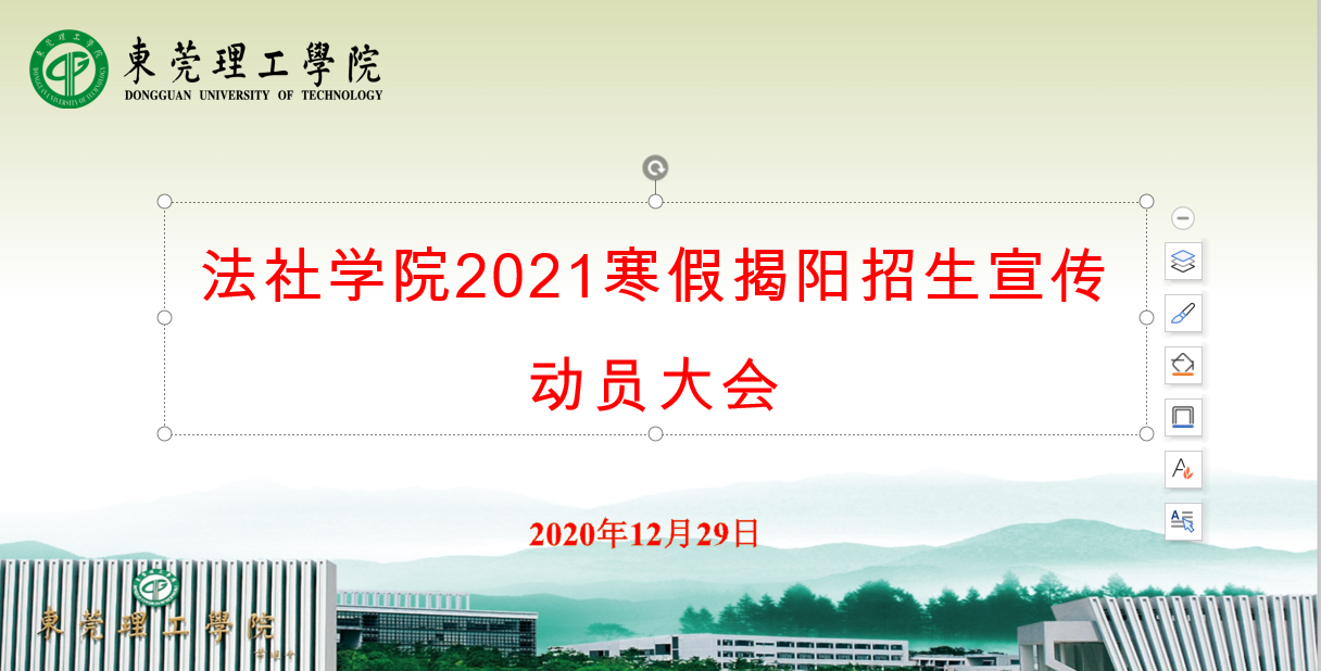 在莞城校区5201会议室召开了揭阳招生宣传队行前动员会。动员会由学院教学副院长朱晓红主持,招生联系人刘海波老师以及宣传队莞城校区全体队员参会。