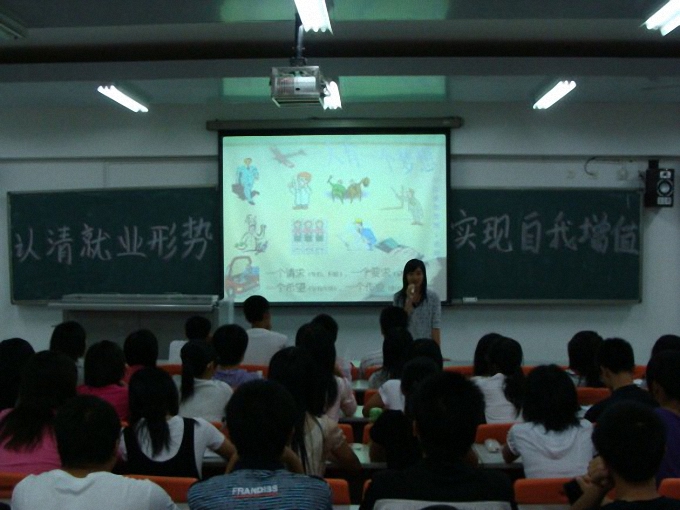 经济危机下严峻的就业形势使大学生面临更大的就业压力,为了让政法学子尽早树立职业生涯规划意识、正确的就业观念,提前做好职业规划,增强就业竞争力。11月6日晚,政法学院在教学楼7B210和7B201课室召开以“认清就业形势,实现自我增值”为主题的职业生涯主题会。来自职业生涯发展协会讲师团的谭泳心、谢晓艳讲师担任本次主题会的主讲,全体大一新生参加了此次会议。