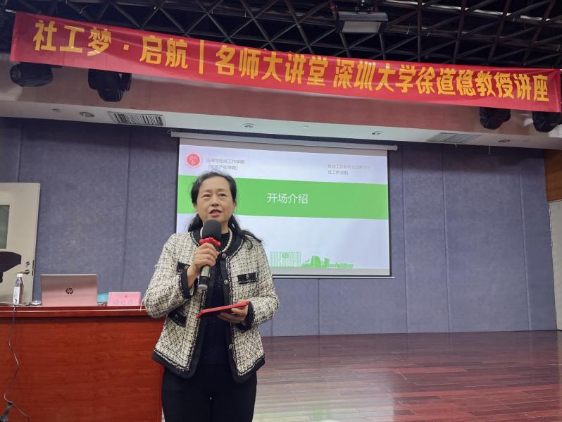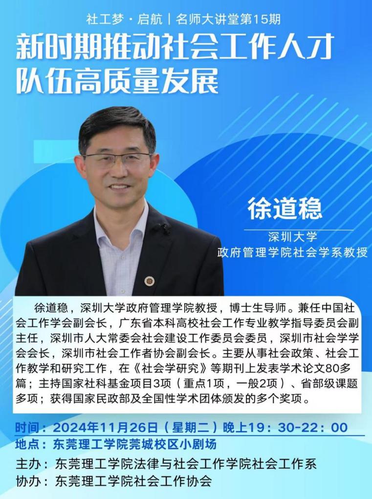 为更好地学习贯彻习近平总书记对社会工作的重要指示精神,2024年11月26日晚,社会工作品牌活动|社工梦·启航|名师大讲堂第15期在莞城校区小剧场举办。本次名师大讲堂活动邀请了深圳大学政府管理学院教授、博士生导师徐道稳教授为我校师生做《新时期推动社会工作人才队伍高质量发展》的学术报告,活动由社会工作系主任成伟教授主持。