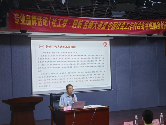 2025年5月22日,“社工梦·启航 名师大讲堂 中国社会工作学会邹学银副会长讲座”在莞城校区学术报告厅举行。本次活动由社工系副主任张雪老师主持,东莞市委社会工作部丁文卿副科长、社会工作系成伟主任、党曦、刘静、张子庄等老师及社会工作系大一至大三学生代表参加了本次讲座。