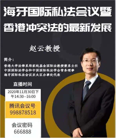 (知识产权学院)邀请到了香港大学法律系郑家纯基金国际法教授兼系主任、中国国际法学会和中国国际私法学会常务理事、海牙国际私法会议亚太区办事处代表赵云教授为我们开展了以“海牙国际私法会议暨香港冲突法的最新发展”为主题的讲座。讲座以腾讯会议的方式在莞城校区5303教室举办,由王敬华副教授主持,2018级法学1、2班全体同学到场聆听。