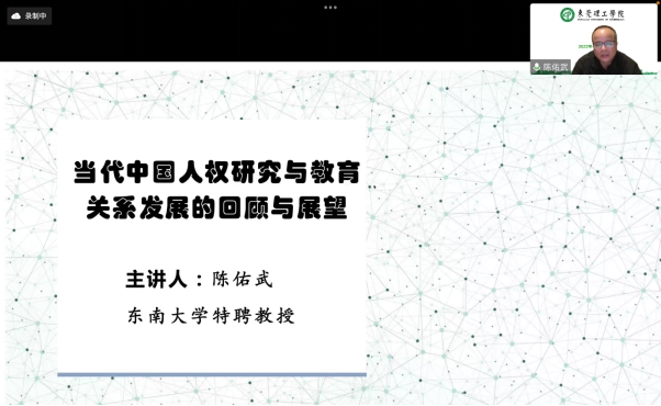 (知识产权学院)法律系于腾讯会议举办线上“法路历程”系列讲座第十八期。本期讲座邀请了东南大学特聘教授、法学院博士生导师、广州大学人权研究院(国家基地)执行院长、中国政法大学兼职教授陈佑武教授为我们讲授“当代中国人权研究与教育关系发展的回顾与展望”。麻豆