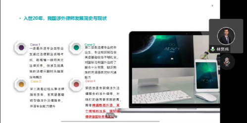 林律师演讲的主题是“以习近平法治思想为指导,加快培养德法兼修的高素质涉外法治人才”。其中,他讲到了入世20年以来,我国涉外律师发展简史与现状。他指出:我国涉外法治人才大致分为二类:第一类是通过法律职业资格考试的外语专业类毕业生,第二类是法律专业的毕业生,通过海外留学或自己的刻苦努力,具有较好的英文水平的法律涉外人才。林律师指出,前者能看懂一般的英文法律文件,但是由于没有经过系统化的法律思维的训练,每当他们遇到具体法律的适用时,提不出来切实可行的法律解决方法;后者虽掌握丰富的法学专业知识,但由于英语基础不够扎实,在与涉外律师的交往和法庭辩论过程中,往往在外语的表达上力不从心。因此,从我国的涉外法律实践上分析,我国亟需培养既具有丰富涉外法律实践经验,熟悉国际贸易规则,又具有扎实的英语读写听说译等能力的涉外法律服务人才。