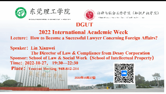 2022年10月27日晚上7点半整,在法社学院知识产权系龚红兵老师的邀请下,德赛西威汽车电子股份有限公司法务总监林贤伟林律师通过线上的方式为麻豆