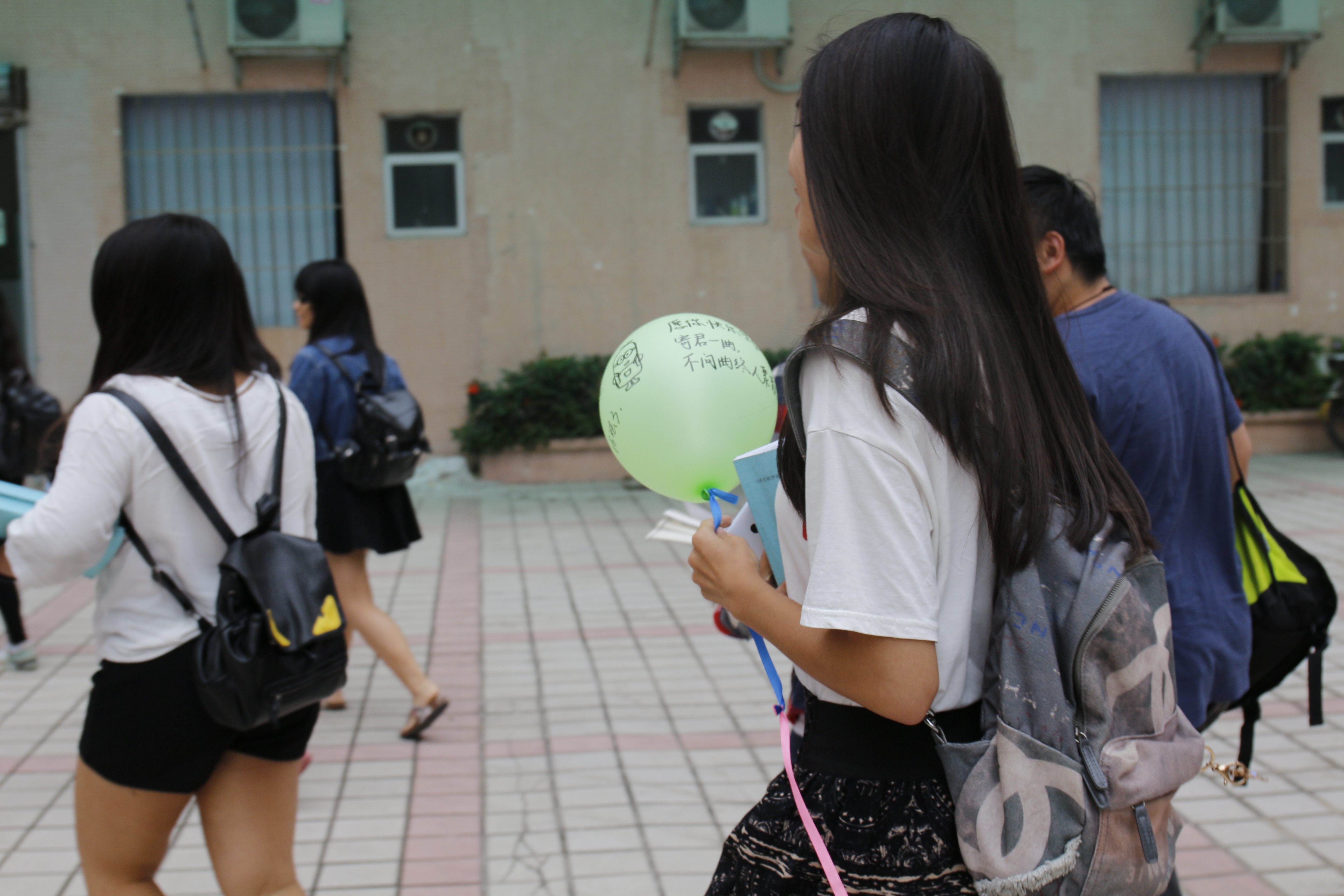 在活动开展之前,同学们都很用心地装饰气球,为气球系上彩带,在气球上写上对他人的祝福,在气球上绘画,画上漂亮可爱的图案,向收到气球的同学表达自己衷心的祝福。
