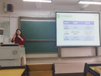 课程分享会伊始,陈彩玲社工先开展了有趣的课前小调查,陈社工问同学们:“80岁,你会面临什么挑战”,这一问题吸引了同学们的注意,并引发了大家的思考,同学也十分积极地回答了陈社工提出的问题。陈社工又细致地介绍了东莞正阳养老的服务内容,并对东莞的“9073养老格局”做出了具体的分析说明。