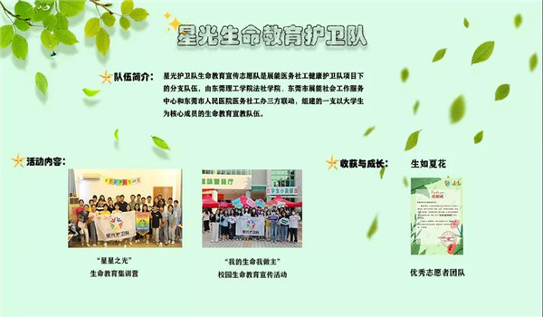 法社学院、东莞市展能社会工作服务中心和东莞市人民医院医务社工办三方联动,成立星光生命教育护卫队,致于组建一支以大学生为核心成员的生命教育宣教队伍,培育学生作为生命教育的同行者,向社会大众倡导生命教育与安宁疗护的理念和知识,让更多人认识和了解生死,尊重和珍惜生命。